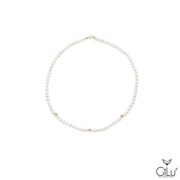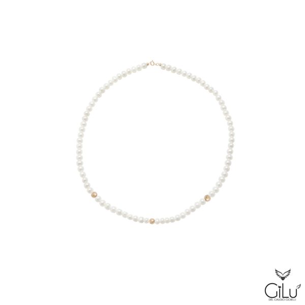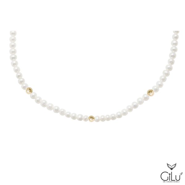 Collana  di perle  con  perle  da  6 mm  e  3  sfere lucide oro giallo  da  6 mm.  Lunghezza  42 cm