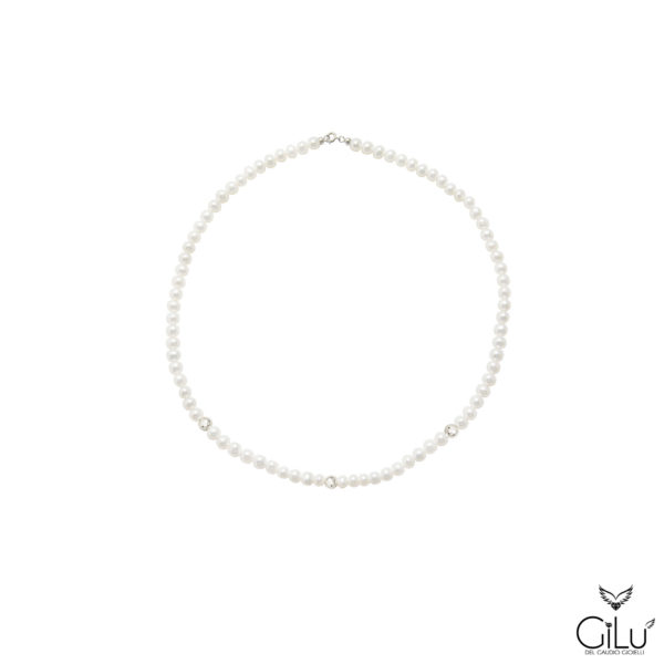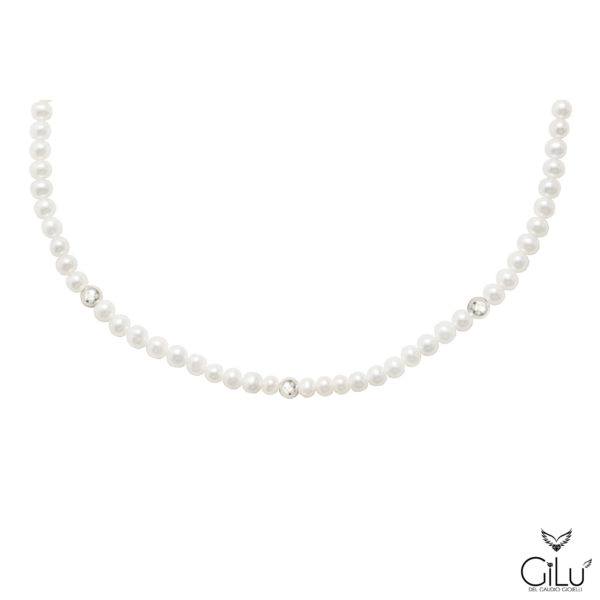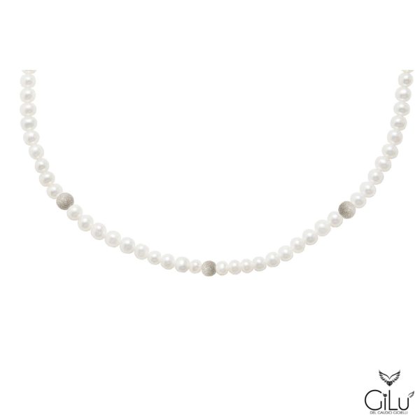 Collana  di perle  con  perle  da  6 mm  e  3  sfere satinate oro bianco  da  6 mm.  Lunghezza  42 cm