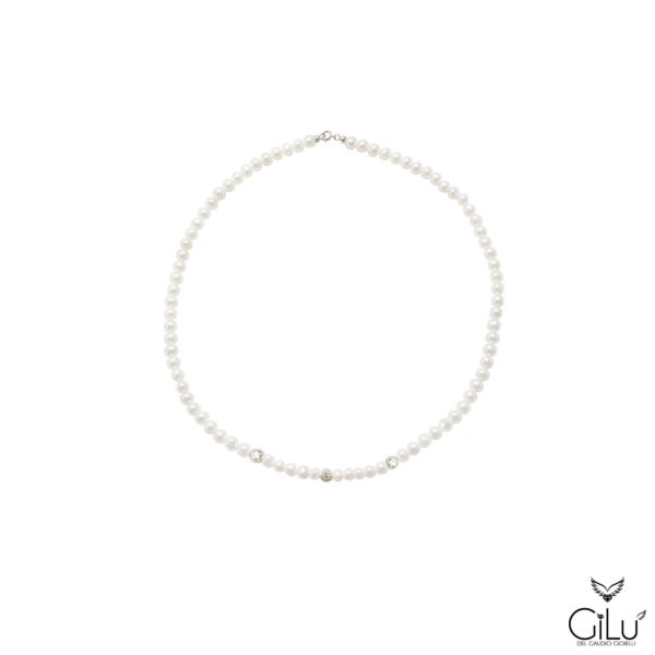Collana  di perle  con  perle  da  6 mm  e  3  sfere lucide oro bianco  da  6 mm.  Lunghezza  42 cm