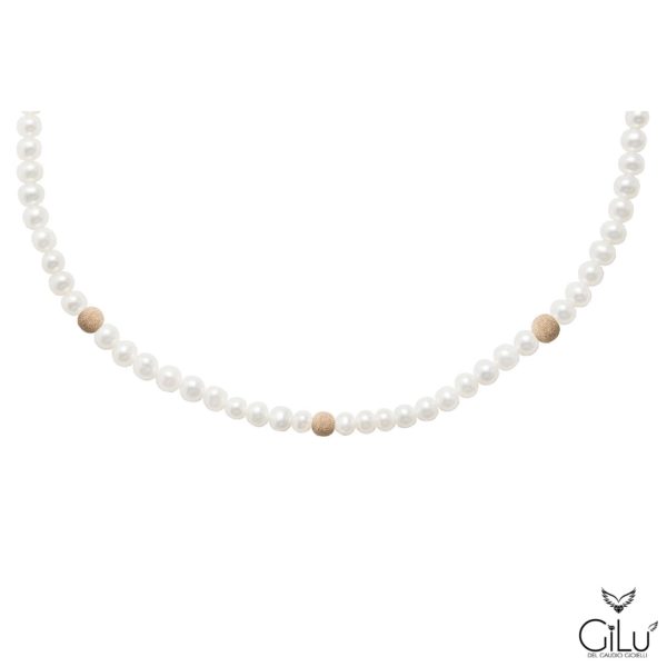 Collana  di perle  con  perle  da  6 mm  e  3  sfere oro rosa satinate  da  6 mm.  Lunghezza  42 cm