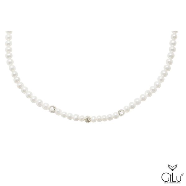 Collana  di perle  con  perle  da  6 mm,  2  sfere lucide oro bianco  da  6 mm  e  1  sfera resina  da  6 mm.  Lunghezza  42 cm