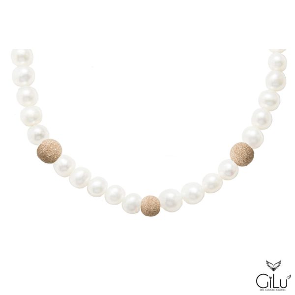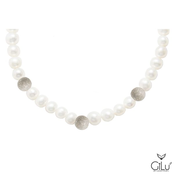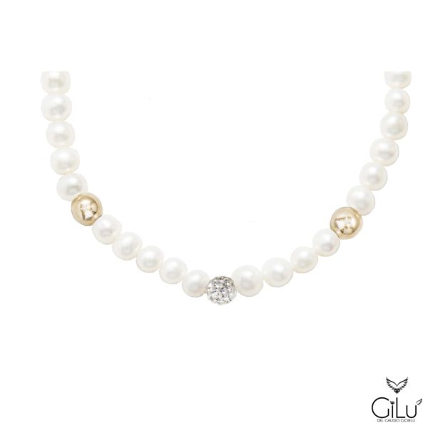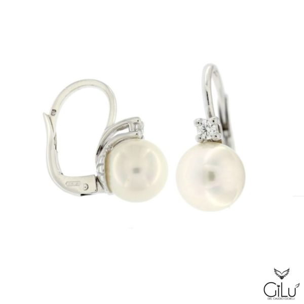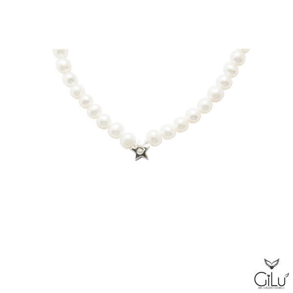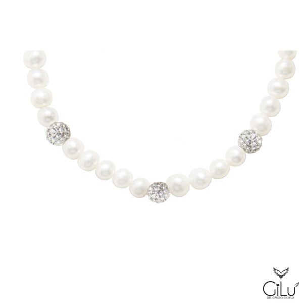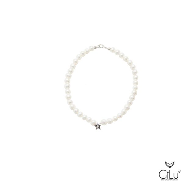 Bracciale di perle con perle da 6 mm e punto luce con brillanti in oro bianco. Lunghezza 18 cm